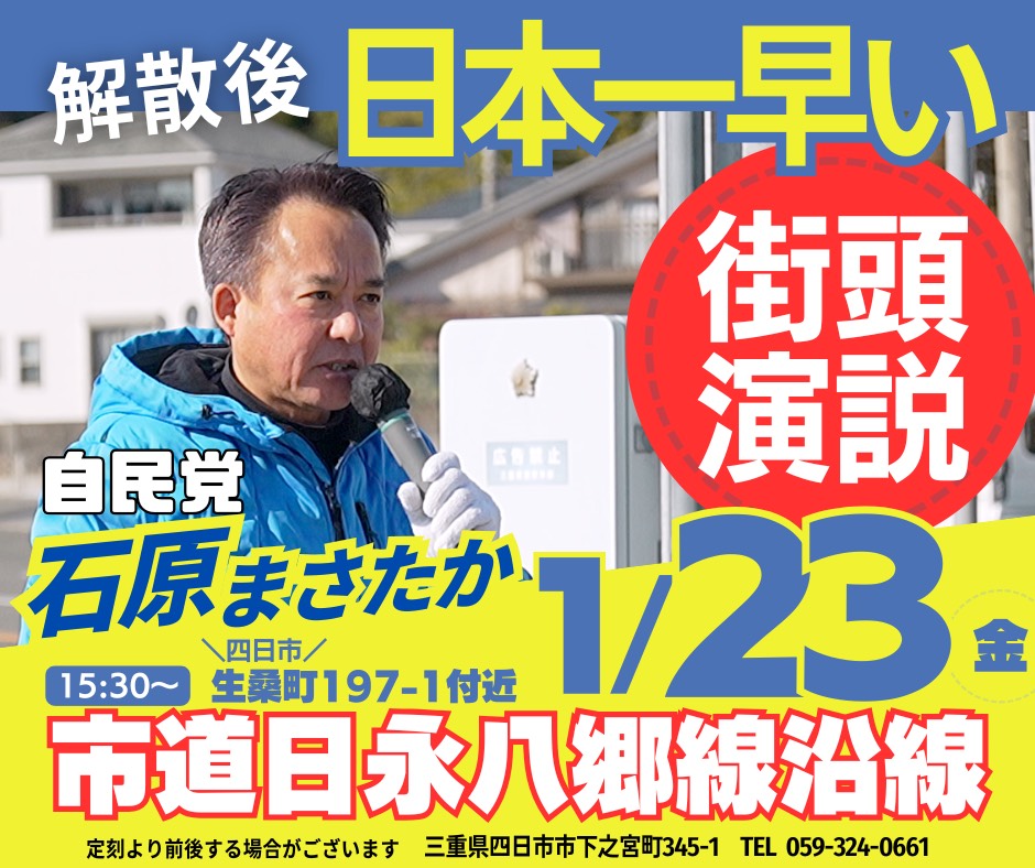 【緊急告知】1月23日(金) 街頭演説 街頭演説 2026年1月22日 お世話になっております。 1月23日(金)15:30~に、緊急街頭演説を実施いたします。 四日市市 市道日永八郷線沿線 生桑町197-1付近です。 ぜひご参加・激励くださいませ!