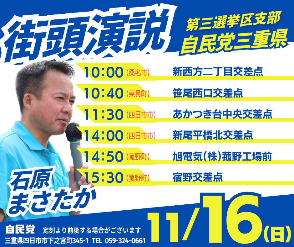 11月16日(日)に、定例の街頭演説を実施いたします。