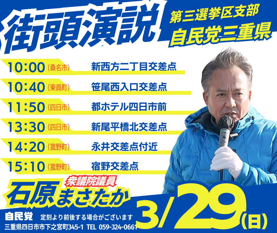 3月29日(日)に、定例の街頭演説を実施いたします。