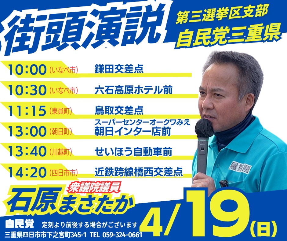 4月19日(日)に、定例の街頭演説を実施いたします。